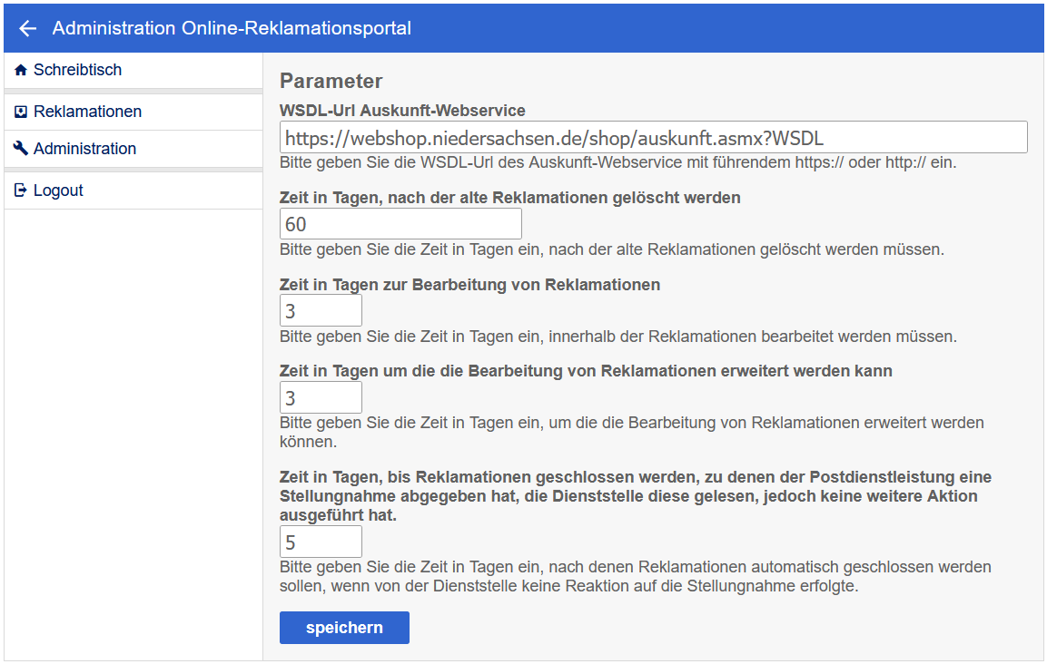 Mit einem Klick auf den Button speichern werden die eingegebenen Parameter gespeichert und wirken sich auf alle nachfolgenden Reklamationen aus.