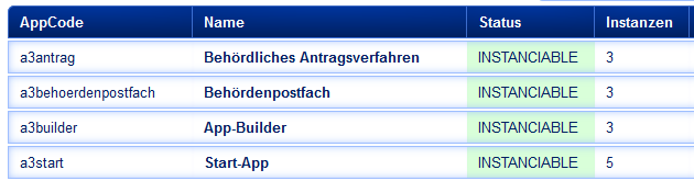 In der ersten Ansicht öffnet sich eine Tabelle mit den verfügbaren Modulen, aus der das Modul Start-App (a3start) mit einem Klick aufgerufen wird.