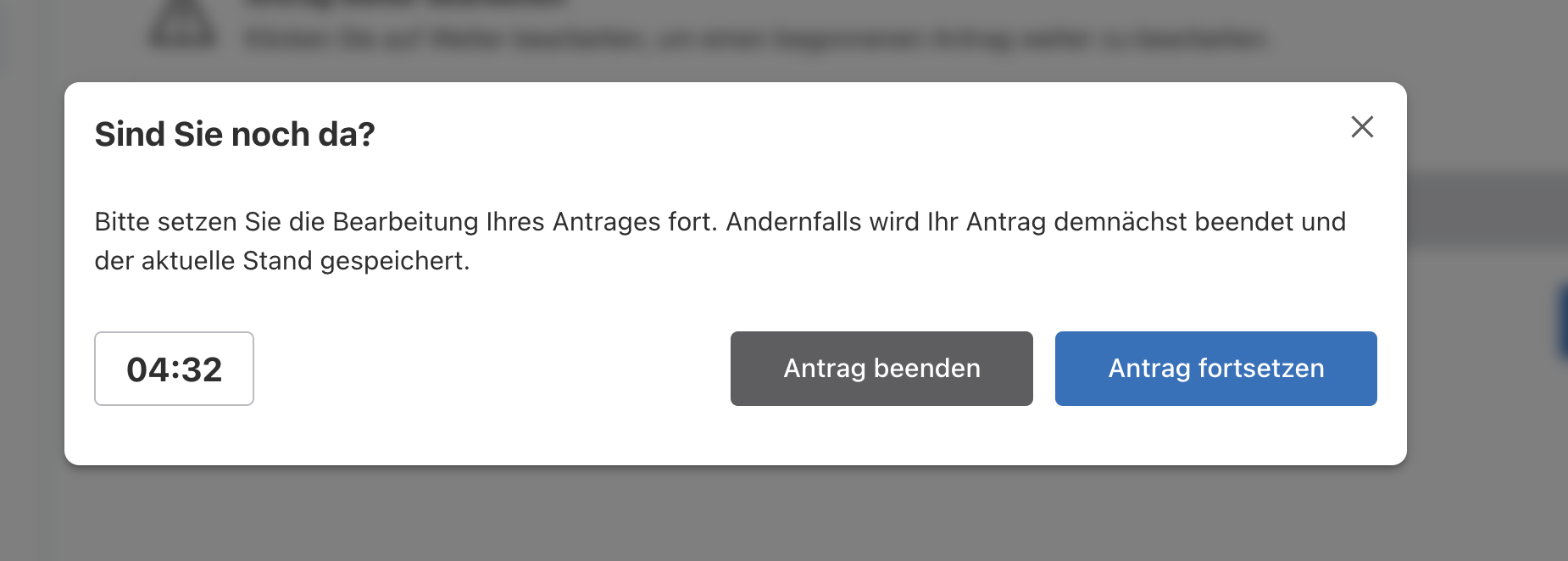 5 Minuten vor Session-Abbruch wird ein Modalfenster angezeigt. Die verbleibende Zeit bis zum Timeout wird als Countdown heruntergezählt.