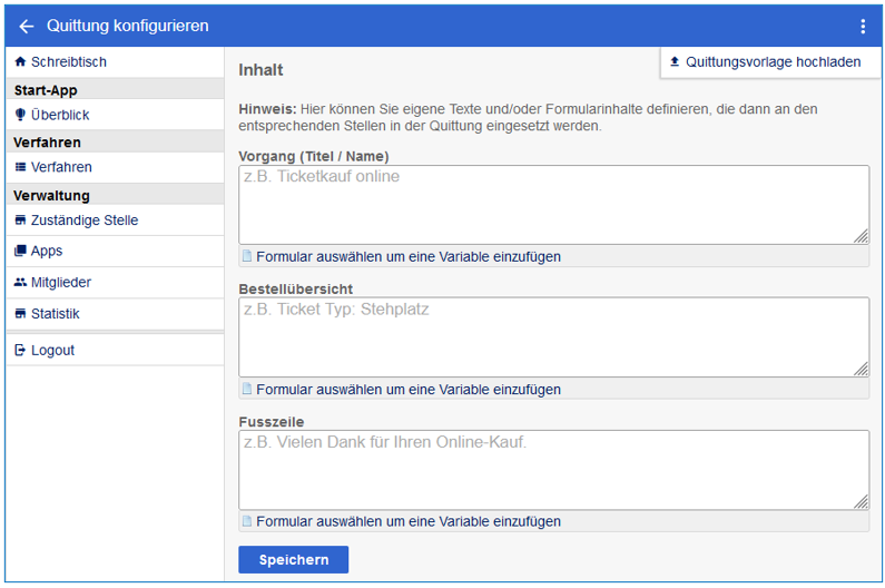 Über Formular auswählen, um eine Variable einzufügen, lassen sich Felder aus dem Datenmodell des Antrags in der Quittung hinzufügen oder Freitext, wie unter „Fußzeile“ – hier „Vielen Dank für Ihre Meldung!“, ergänzen.