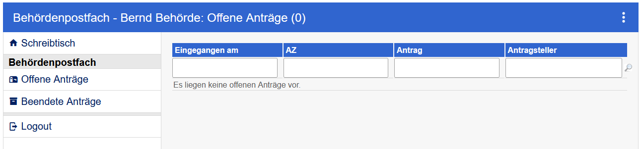 Offene Anträge bleiben im Behördenpostfach, bis sie auf beendet gesetzt werden.