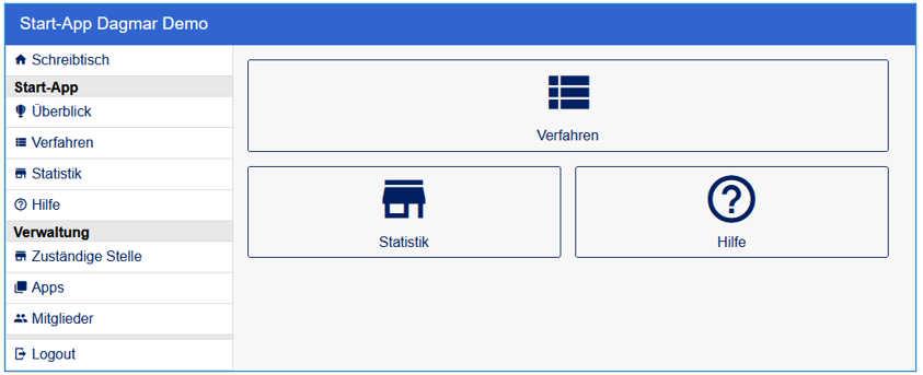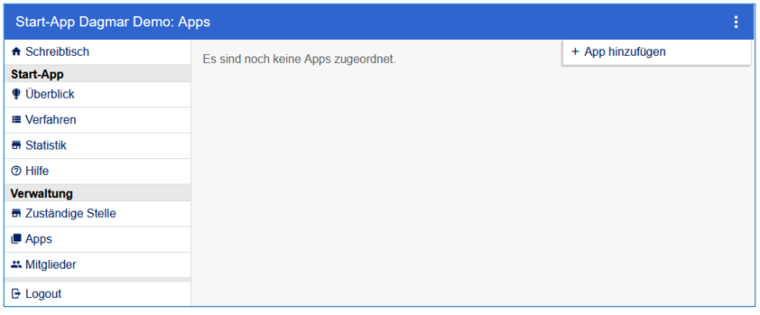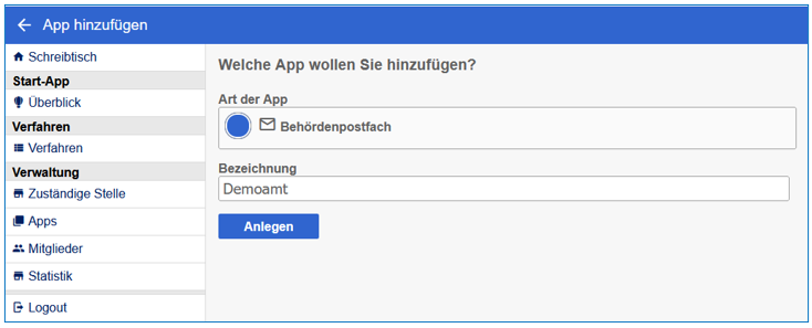 Nach dem Aufruf der Start-App über den Schreibtisch kann durch einen Klick auf den Button Apps im Menü an der linken Seite der Dialog zum Anlegen von Apps geöffnet werden, mit dem sich zu dieser Start-App gehörige Behördenpostfächer einrichten lassen: