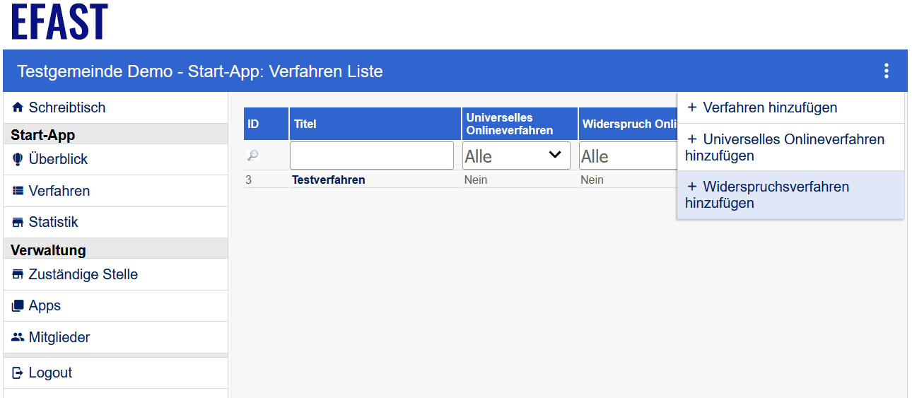 Bevor ein Widerspruchsverfahren einem Verfahren der EFAST-Plattform zugeordnet werden kann, muss mindestens ein Widerspruchsverfahren im System angelegt sein. Wenn bereits ein Widerspruchsverfahren existiert, kann dieses für unterschiedliche Leistungen genutzt werden.