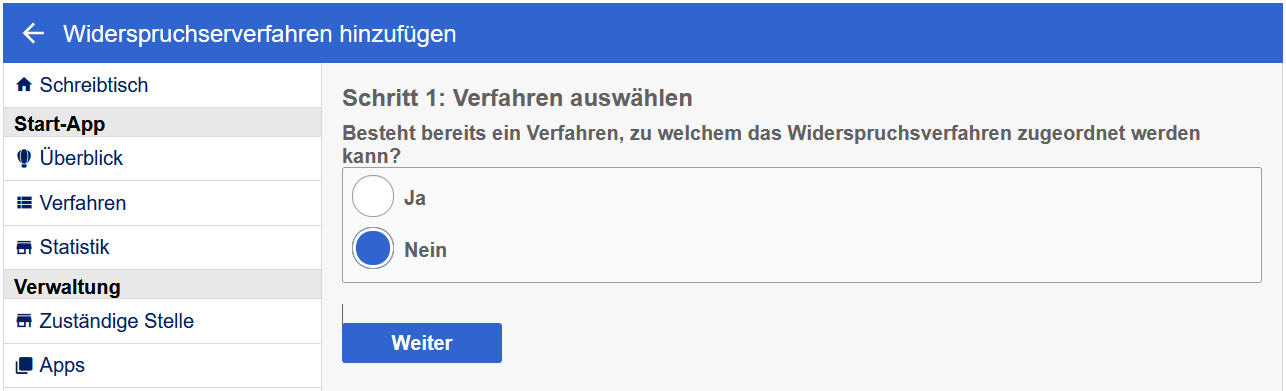 Wird die Option Nein ausgewählt, öffnet sich der Dialog zum Anlegen des Widerspruchsverfahrens direkt, ohne dass zuvor eine Liste der in der Start-App angelegten Verfahren angezeigt wird.