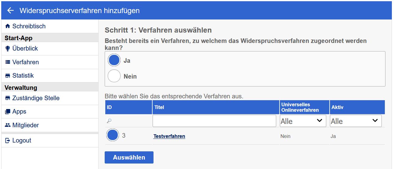 Bevor ein Widerspruchsverfahren einer behördlichen Leistung hinzufügen kann, muss festgelegt werden, ob der Widerspruch zu einem bestehenden Verfahren erfolgen soll oder nicht.