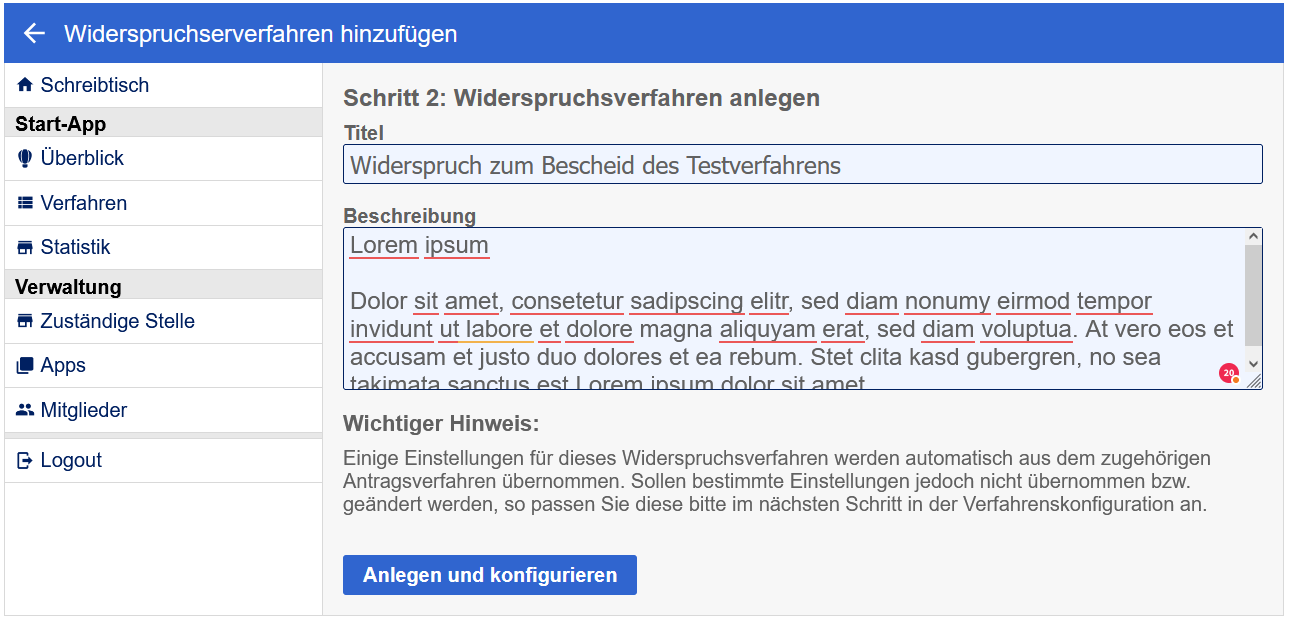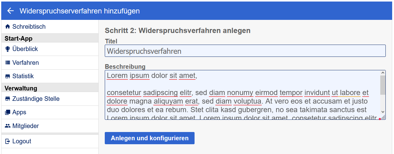 Durch einen Klick auf den Button Weiter öffnet sich der Dialog, mit dem das Widerspruchsverfahren angelegt wird, indem man einen Titel vergibt und die Beschreibung festlegt.