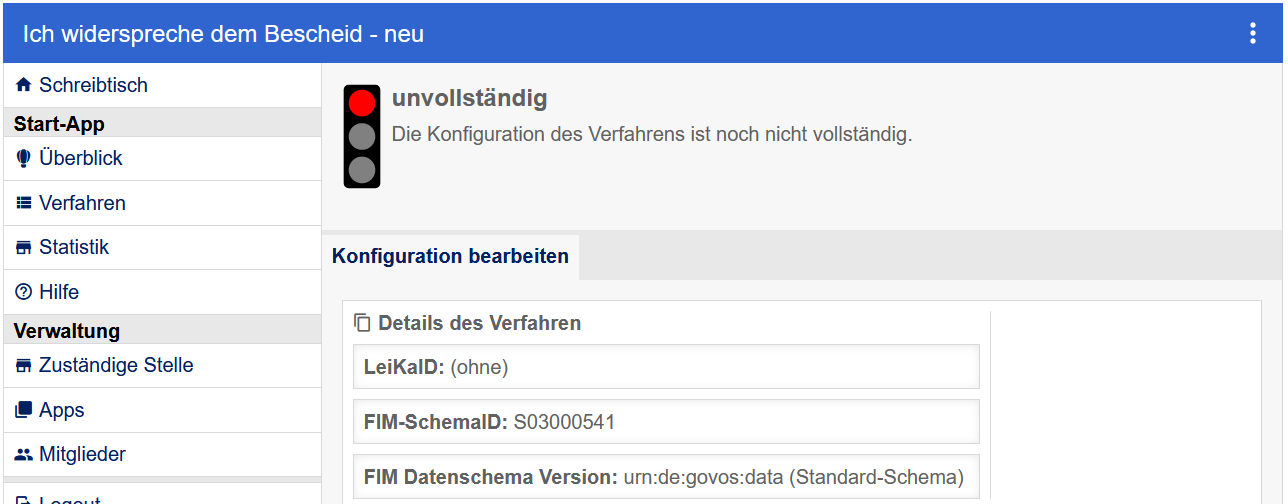 Die Konfiguration des Widerspruchsverfahrens folgt den normalen Regeln für die Konfiguration einer behördlichen Leistung auf einer EFAST-Plattform. Ähnlich dem universellen Online-Dienst ist der Container für das Widerspruchsverfahren in der Plattform hinterlegt und wird nicht aus dem Marketplace bezogen.