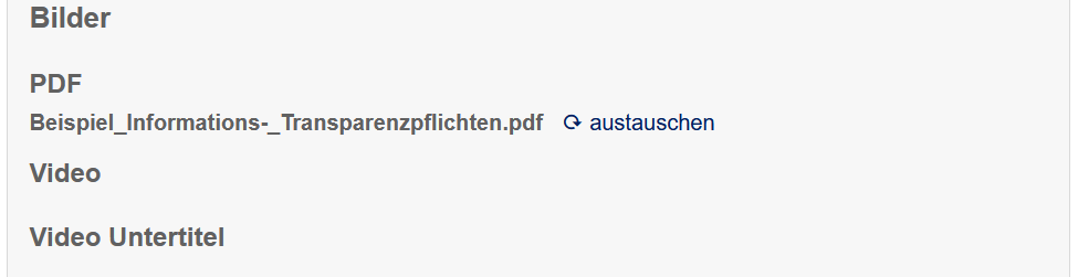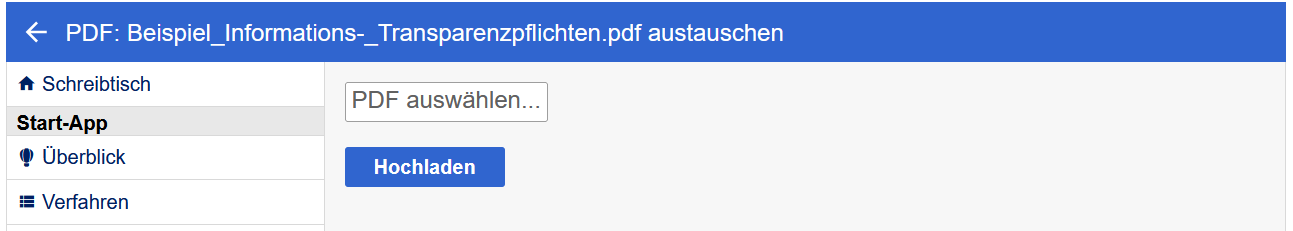 Am unteren Ende der Konfigurationsseite für das Verfahren findet sich eine Auflistung von im Verfahrenscontainer hinterlegten Dateien. Hier wird die Datei Beispiel_Informations-_Transparenzpflichten.pdf angezeigt. Mit der Funktion austauschen am Ende des Dateinamen lässt sich diese durch eine eigene Datei ersetzen.