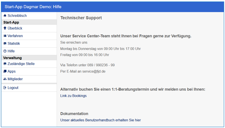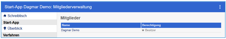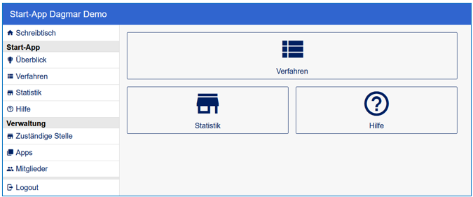 Im Bereich der "Start-App" wird der Name für alle Unterkategorien einer App entsprechend angepasst und somit für "Verfahren", "Statistik", "Zuständige Stelle", "Apps", "Mitglieder" und "Hilfe" in die Titelzeile übernommen.