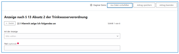 Wenn "Vorbefüllen Upload aktiv" ausgewählt wurde, kann ein Antragsteller bei Antragsstart, den Antrag mit Daten aus einer hochgeladenen Datei vorbefüllen.