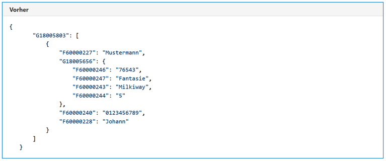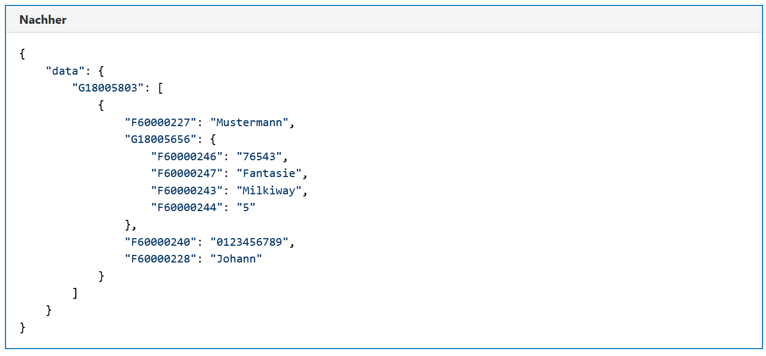 Der einfachste Weg zu einer gültigen Datei führt über einen abgesendeten Antrag, da dieser die gewünschte Datei „fachdaten.json“ im richtigen Format beinhaltet (Fachdaten: JSON ohne Schema data.json). Diese Datei ist im Posteingang zu finden. Einzig notwendige Änderung ist, dass die Daten mit dem Element „data“ geklammert werden müssen (s. unten "Vorher“ - "Nachher").