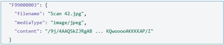 Damit der Datei-Upload funktioniert, sollten die JSON-Daten dem gleichen Schema wie oben folgen. Hierbei werden jedoch für Anlagen weitere Angaben benötigt.