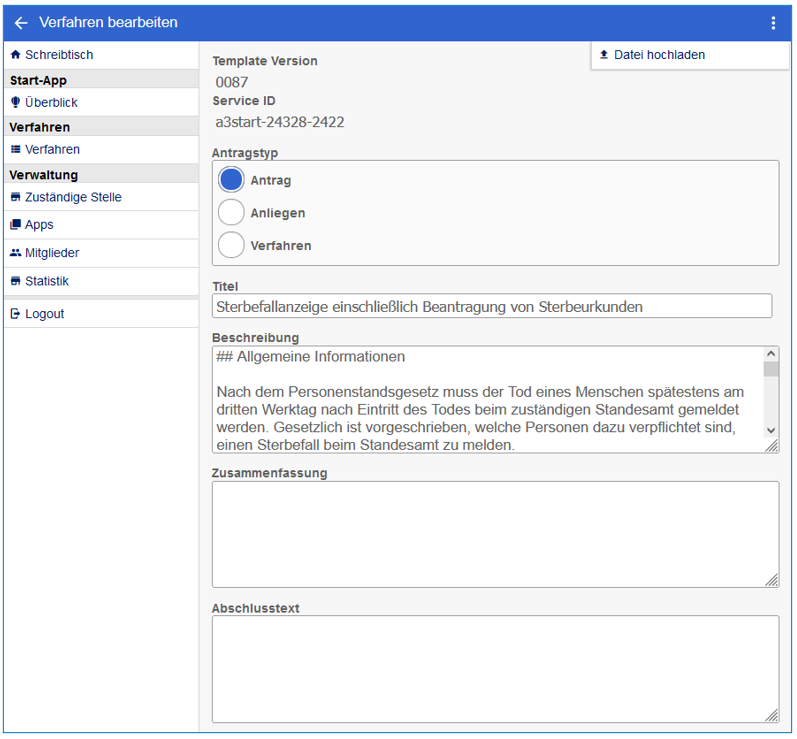 Mit Klick auf “löschen” wird die hochgeladene Datei gelöscht und das standardmäßig im Verfahren hinterlegte PDF wieder verwendet.