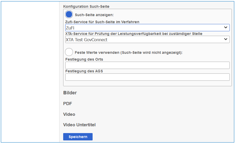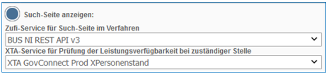Diese Konfigurationsmöglichkeit erscheint nur bei Online-Diensten, die für eine Zustellung per XTA vorbereitet wurden. Sie ist erforderlich, um über das Deutsche Verwaltungsdiensteverzeichnis DVDV das passende Zustellziel zu bestimmen. Die Option "Such-Seite anzeigen" setzt die Anbindung an eine Instanz der Software Infodienst Zuständigkeitsfinder (ZuFi) der Firma TSA voraus, da damit eine Postleitzahl in den AGS der zuständigen Behörde aufgelöst werden kann. Beispiele für solche Instanzen sind das Serviceportal Niedersachsen (BUS) oder der Zuständigkeitsfinder (ZuFi) im Serviceportal Thüringen.