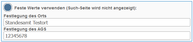 Im Falle der Sterbefallanzeige, müssen feste Werte verwendet werden. Es wird der Ort und AGS ("Amtlicher Gemeindeschlüssel") eingetragen, um die Zustellung an ein Standesamt festzulegen.