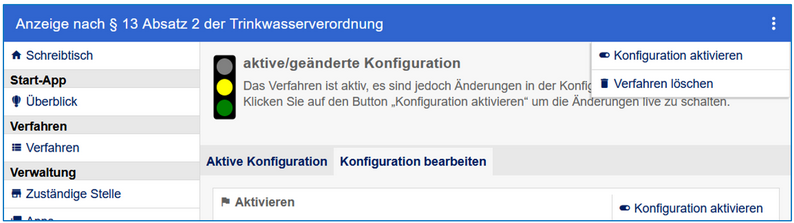 Nachdem Änderungen durchgeführt wurden, wird darauf hingewiesen, dass die Konfiguration erneut aktiviert werden muss. Die Ampel springt nach Aktivierung von "gelb" auf "grün":