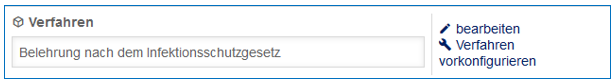 Bei bestimmten Antragsverfahren ist vorgesehen, dass Bestandteile der Antragsstrecke angepasst werden können oder sogar müssen. In solchen Fällen ist die Option "Verfahren vorkonfigurieren" zu sehen. Beim Verfahren „Belehrung nach dem Infektionsschutzgesetz“ wird so beispielsweise festgelegt, was aus einer Liste auswählbar ist. Dazu wählt man Verfahren vorkonfigurieren aus.