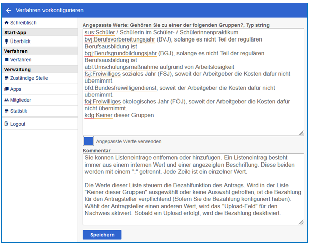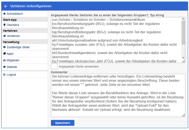 Wird der Stift oder prepare ausgewählt, besteht die Möglichkeit, Listeneinträge für die Auswahl bei Antragsstellung anzupassen, zu ergänzen oder zu löschen.