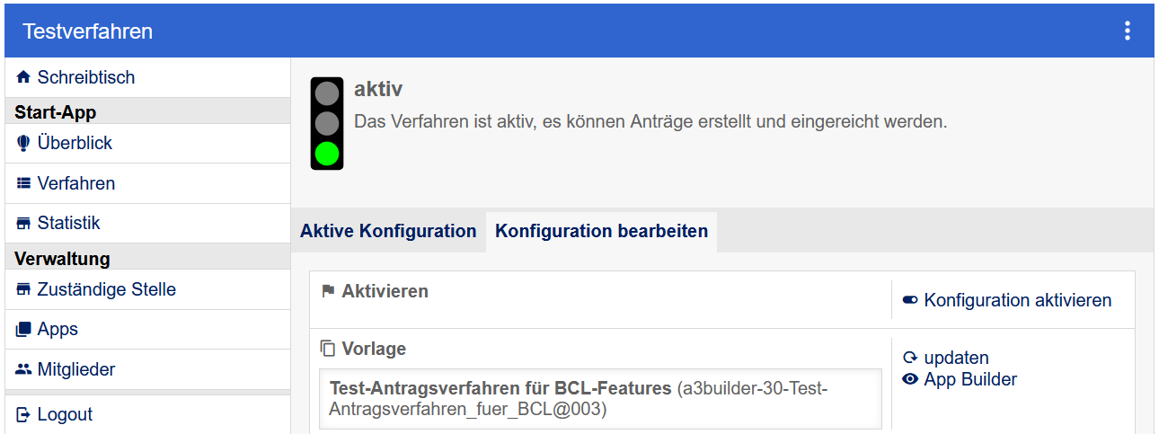 Nach dem Speichern der ausgewählten Option wird wieder die Verfahrenskonfiguration angezeigt. Um die Änderung zu übernehmen, muss die geänderte Konfiguration aktiviert werden.