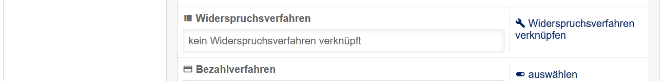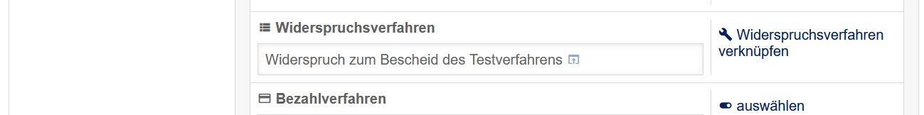 Nach der Auswahl eines Widerspruchsverfahrens aus der Liste und der Bestätigung durch einen Klick auf Speichern gelangt man zurück in die Verfahrenskonfiguration. Dort wird das verknüpfte nun Verfahren angezeigt und mit einem Klick auf den Link hinter dem Titel gelangt man in die Konfiguration des Widerspruchsverfahrens.