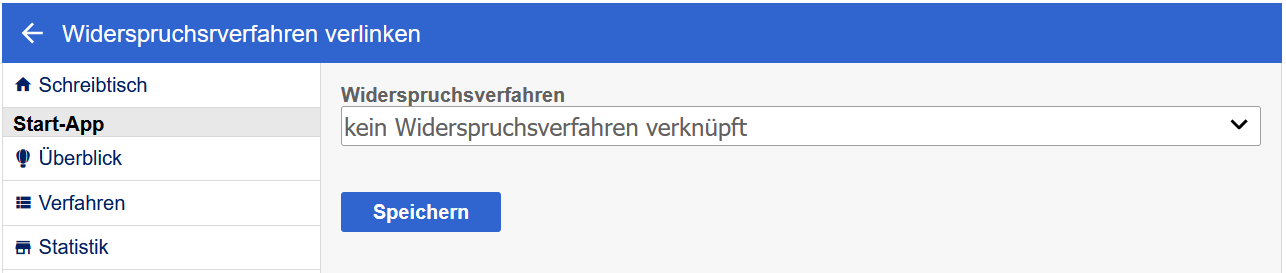 Soll die Verknüpfung zu einem Widerspruchsverfahren entfernt werden, so muss kein Widerspruchsverfahren verknüpft aus der Menüauswahl des Dialogs gewählt werden und der Button Speichern angeklickt werden.