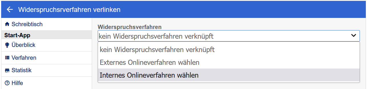 Um eine bereits angelegtes, internes Widerspruchsverfahren mit einem Online-Dienst einer EFAST-Plattform zu verknüpfen, muss die Option Internes Onlineverfahren wählen selektiert werden. Dadurch öffnet sich eine Liste der im System angelegte Widerspruchsverfahren (siehe Ein Widerspruchsverfahren anlegen).