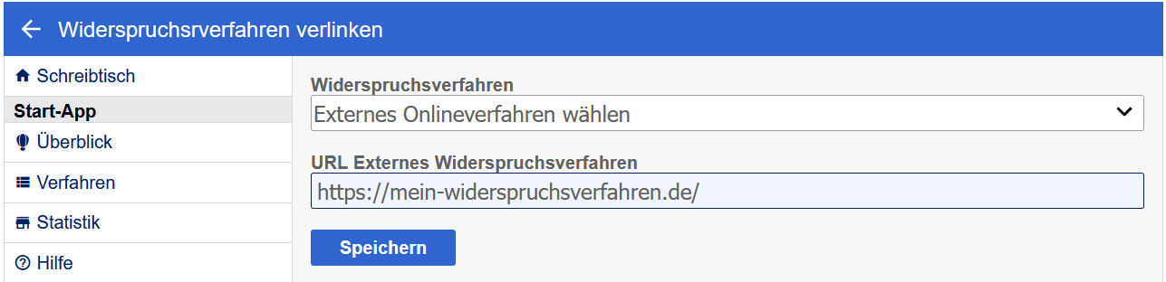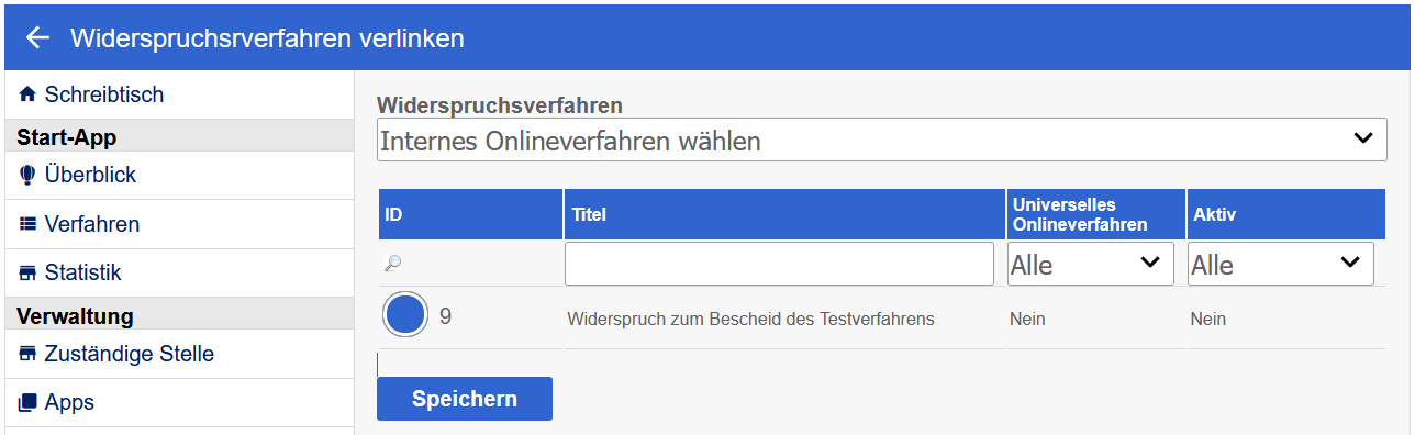 In der Verfahrenskonfiguration zu einem Online-Dienst in einer Start-App findet sich der Punkt Widerspruchsverfahren und der Menüpunkt Widerspruchsverfahren verknüpfen.