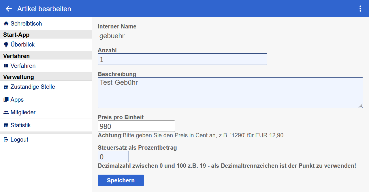 Bei Online-Diensten, die durch die FJD erstellt wurden, sind in der Regel die entsprechenden Artikel im Antrag bereits mit Preisen hinterlegt, sodass ggf. nur der Steuersatz ergänzt werden muss oder bei Bedarf der Preis angepasst werden kann.