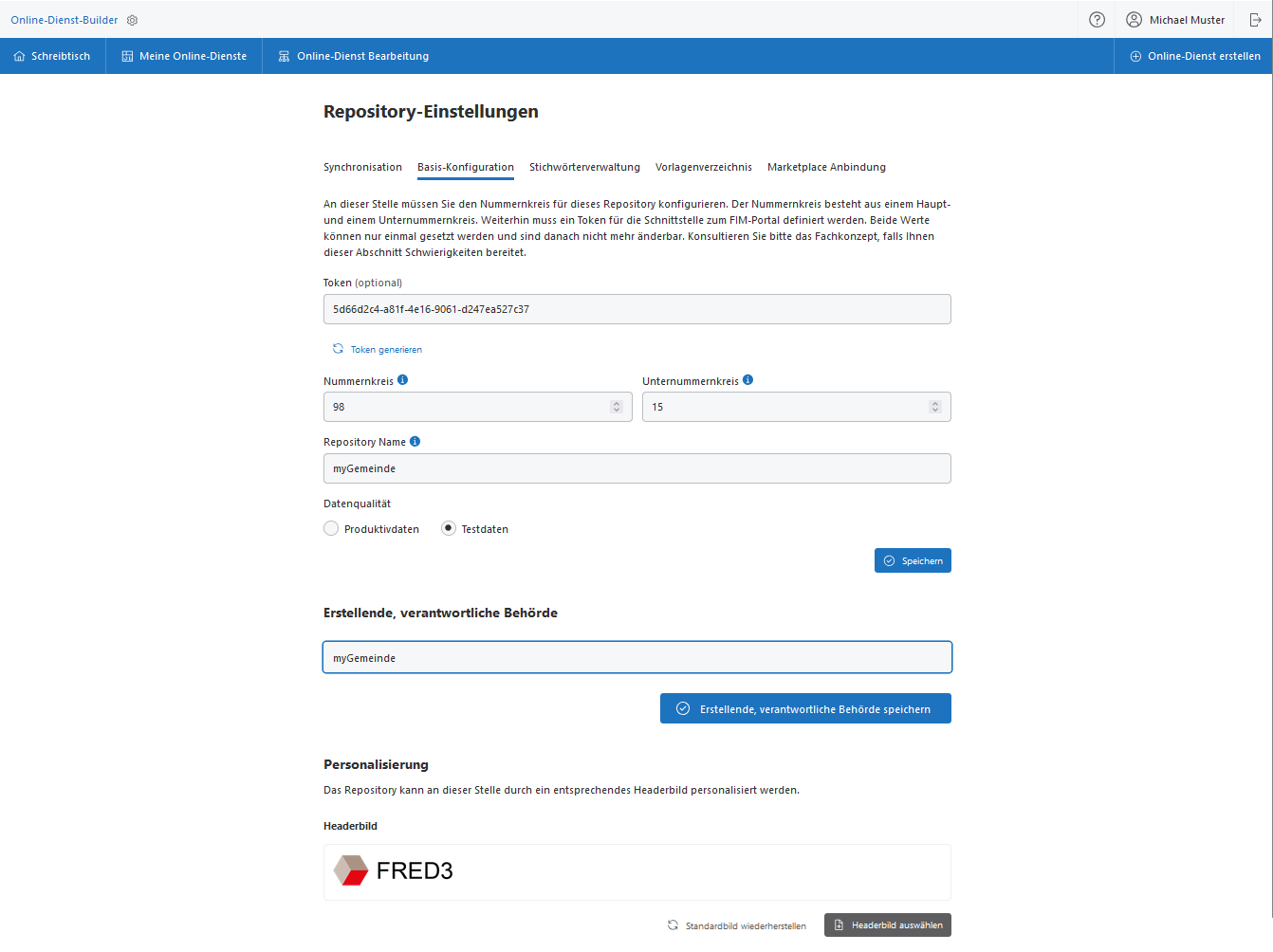 Die Konfiguration Repository-Einstellungen benötigt Angaben zum Nummernkreis und Unternummernkreis von FIM, die für das Datenschema hinter den Online-Diensten, genutzt werden sollen. Diese können nicht frei gewählt werden und werden vergeben. Bitte bei der FJD Information Technologies AG erfragen, wenn keine Angaben vorliegen.