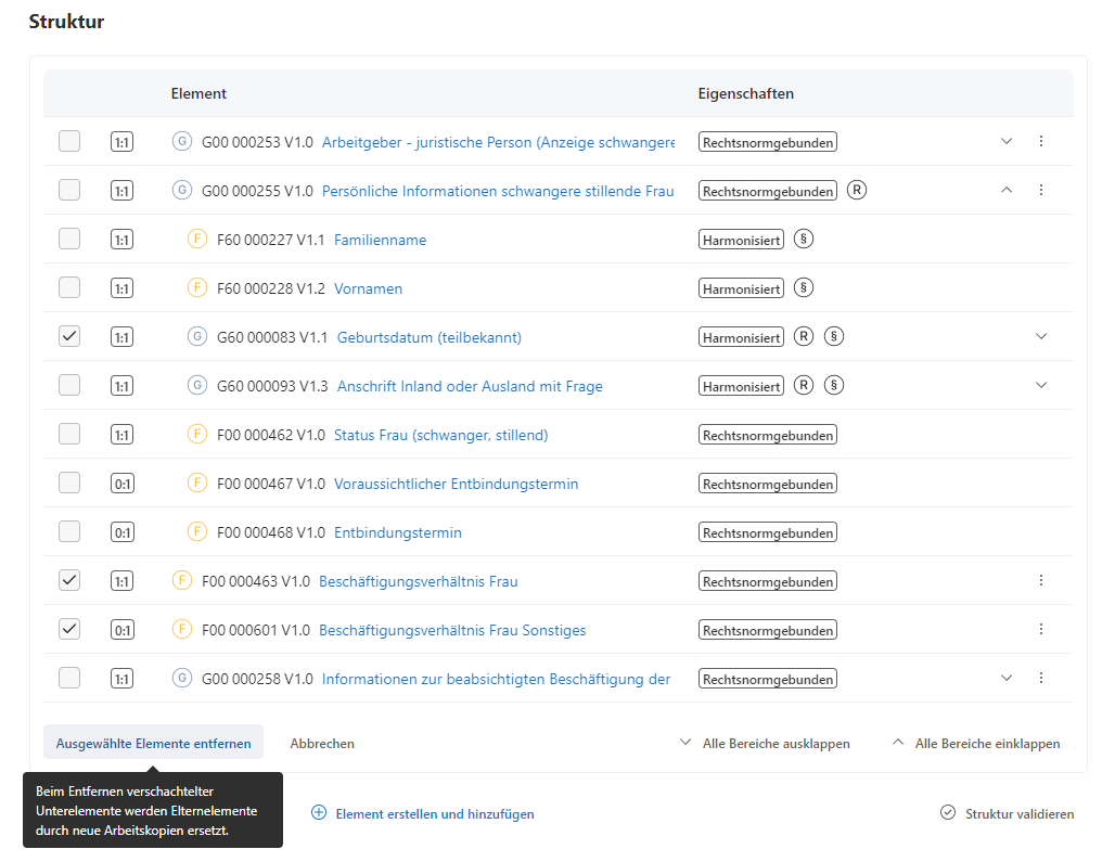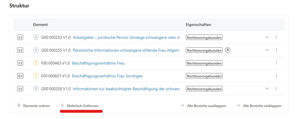 Der neue Editor bitte ein Komfortfeature zur schnelleren Bearbeitung von Datenfeldgruppen und Datenschemata an. Diese Funktion ermöglicht es, mehrere Elemente gleichzeitig aus einer Struktur zu entfernen.
