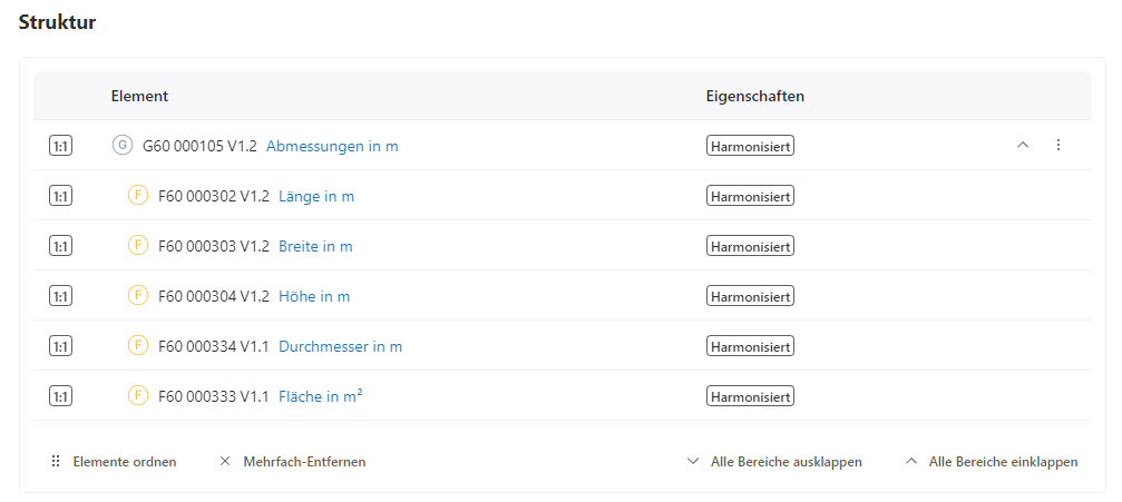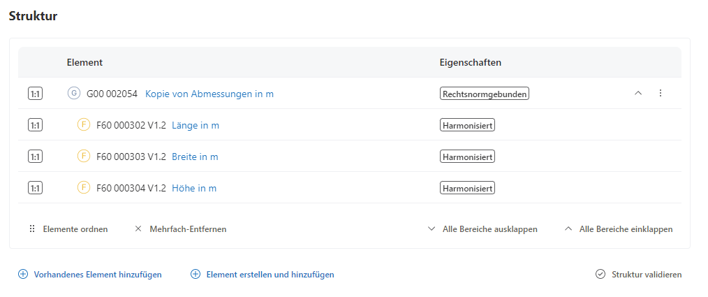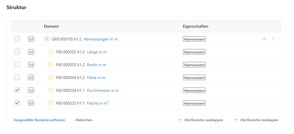 Im nächsten Schritt wird auf “Ausgewählte Elemente entfernen” geklickt. Daraufhin wird eine neue Arbeitskopie von “Abmessung in m” erstellt, die den Namenszusatz “Kopie von” trägt. Der Name muss im Nachgang angepasst werden.