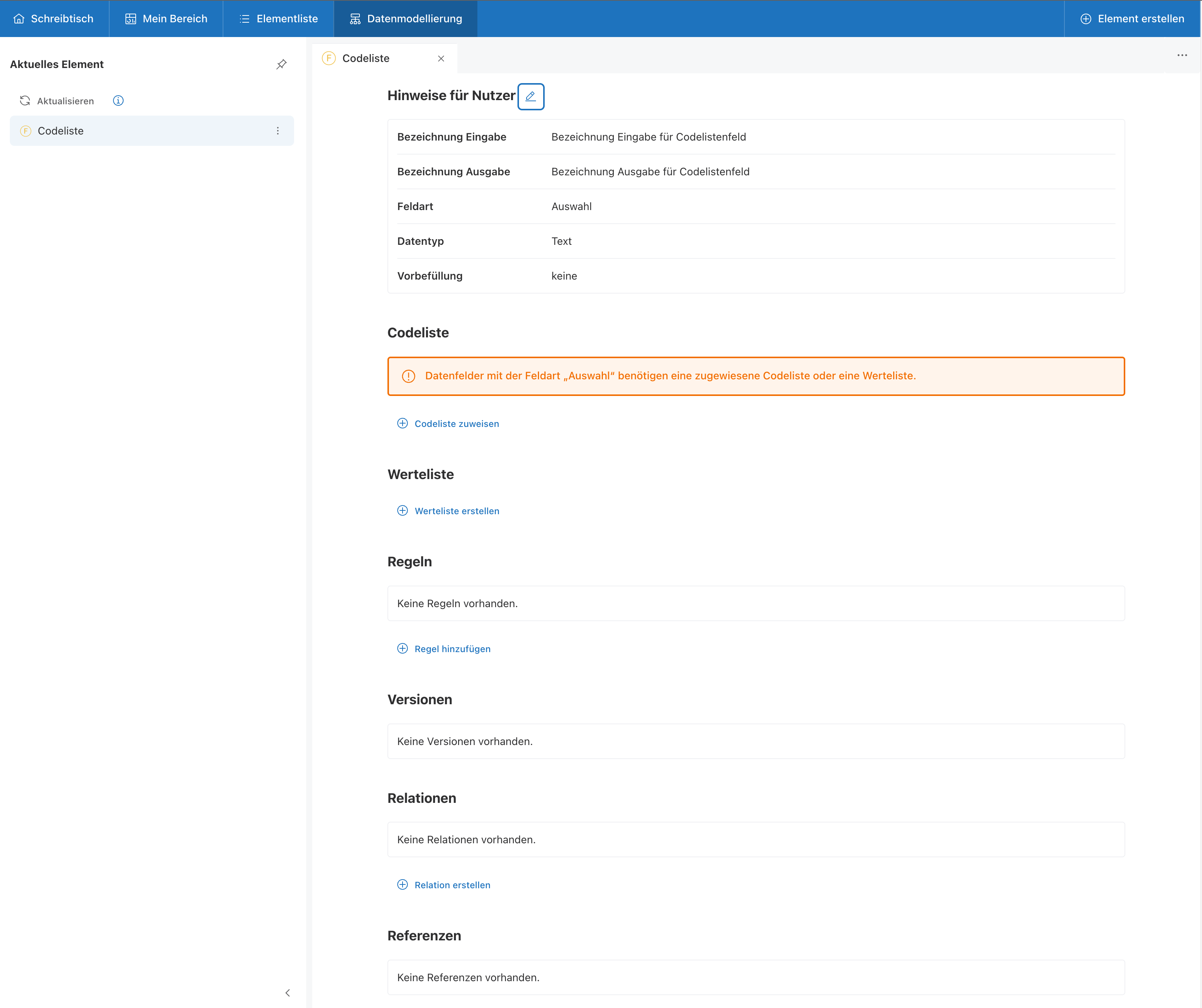Eine Codeliste ist eine Liste von vordefinierten Werten die aus dem XRepository stammt. Sie können zu Datenfeldern mit Feldart “Auswahl” hinzugefügt werden.