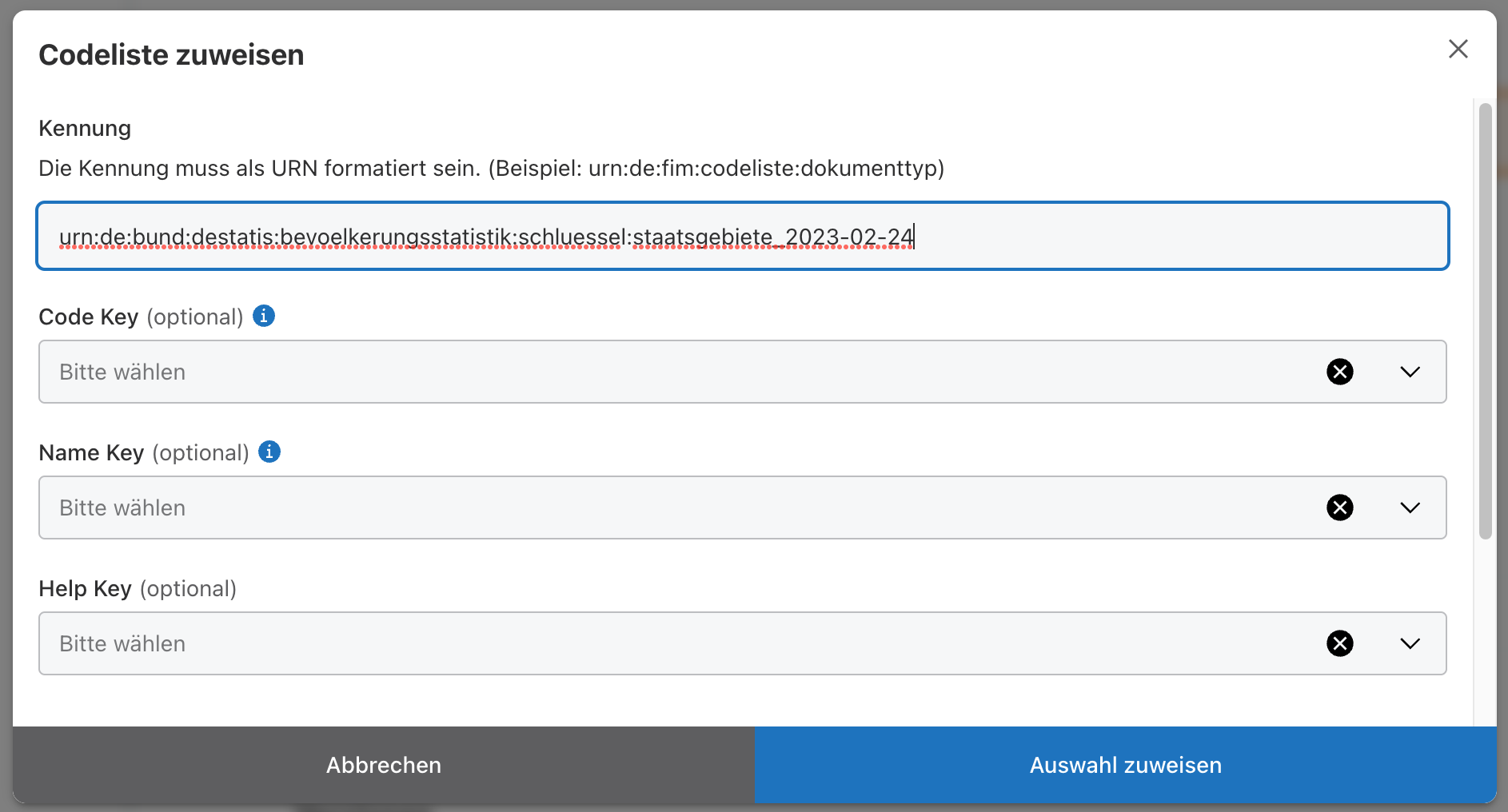 Durch hinzufügen einer URN aus dem XRepository inkl. Versionskennung ist die Codeliste vollständig. Optional kann noch ein Code Key, Name Key und Help Key hinzugefügt werden.