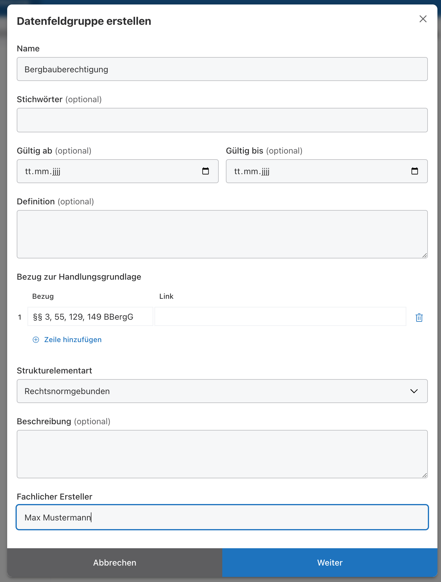 Datenfeldgruppen sind Elemente, die vielfältig in unterschiedlichsten Schemata verwendet werden können und somit eine Gruppe von Daten bilden.
