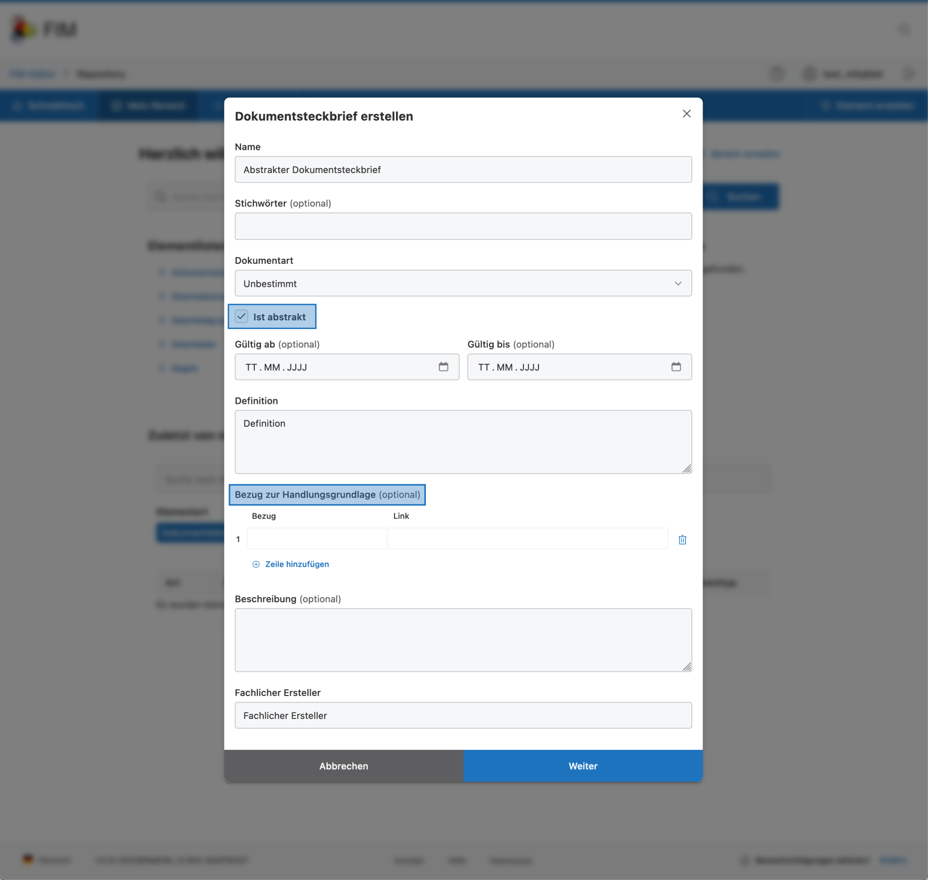 Die Handlungsgrundlage von abstrakten Dokumentsteckbriefen ist ein optionales Feld.