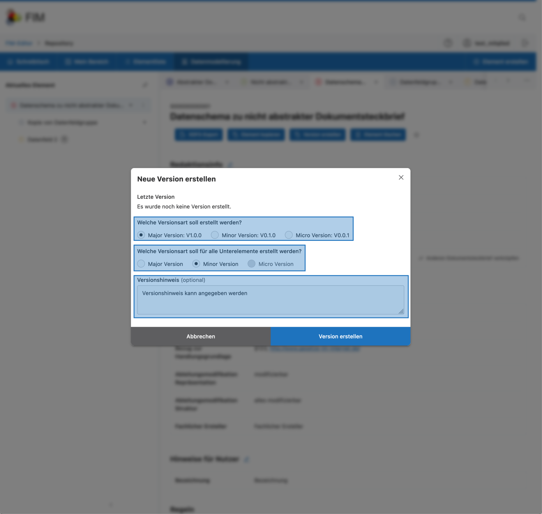 Welche Versionsnummer hochgezählt wird, kann jeweils für ein Element und für alle Elemente dieser Struktur gesondert angegeben werden.