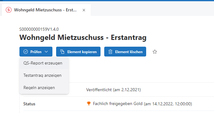 Diverse Prüfverfahren (QS-Bericht, Testantrag, sowie die bereits erwähnte Regelansicht) sind über das Menü wählbar.