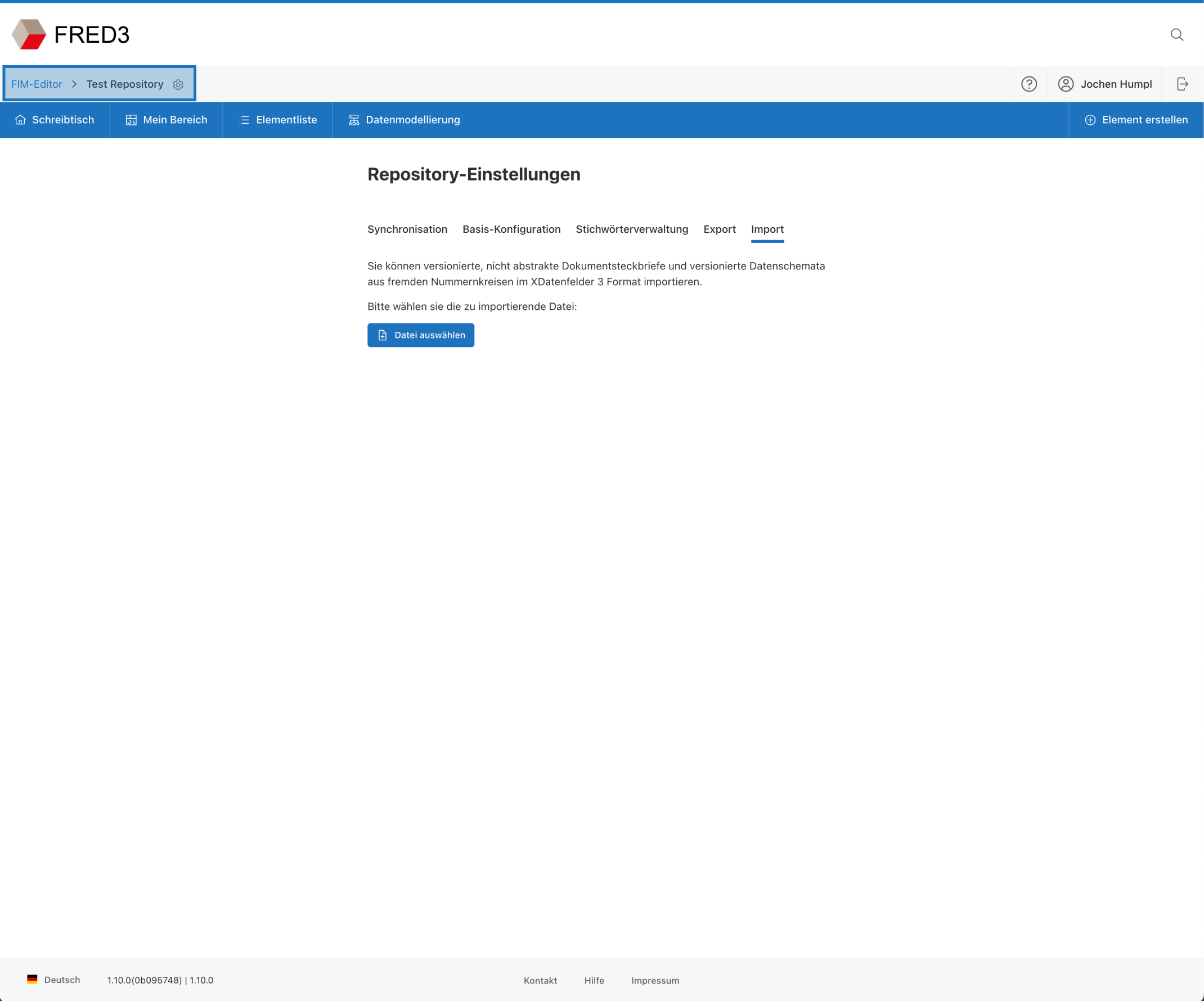 Mit Klick auf das “Zahnrad” Symbol oben rechts und mit Auswahl des Tabs “Import”, haben Sie die Möglichkeit, versionierte, nicht abstrakte Dokumentsteckbriefe und versionierte Datenschemata aus fremden Nummernkreisen im XDatenfelder 3 Format importieren.