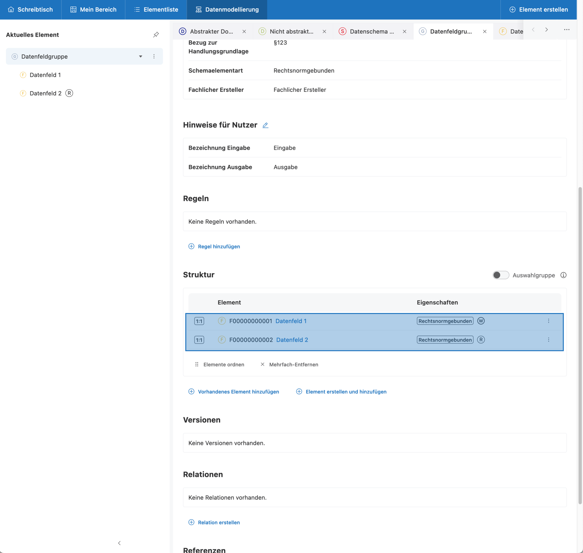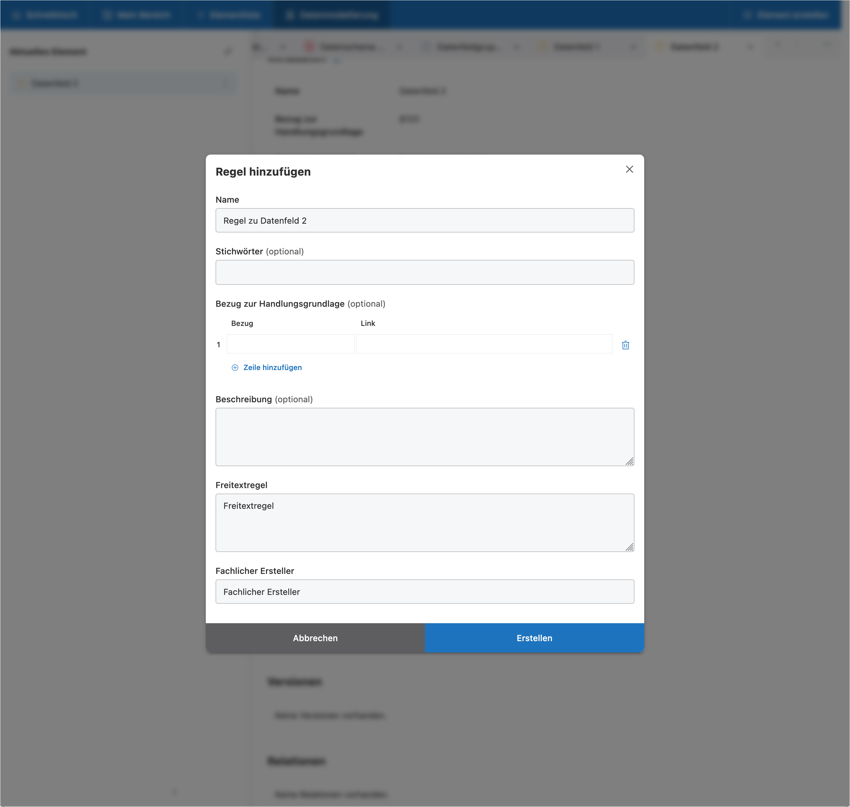 - Zu einem bereits in den vorherigen Schritten erzeugten Datenschema, einer Gruppe oder einem Feld werden ein oder mehrere Regeln erfasst.