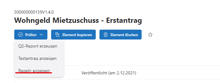 Unter dem Reiter “Prüfen” → “Regeln anzeigen” können alle Regeln zu einem Datenschema oder zu einer Gruppe eingesehen werden.