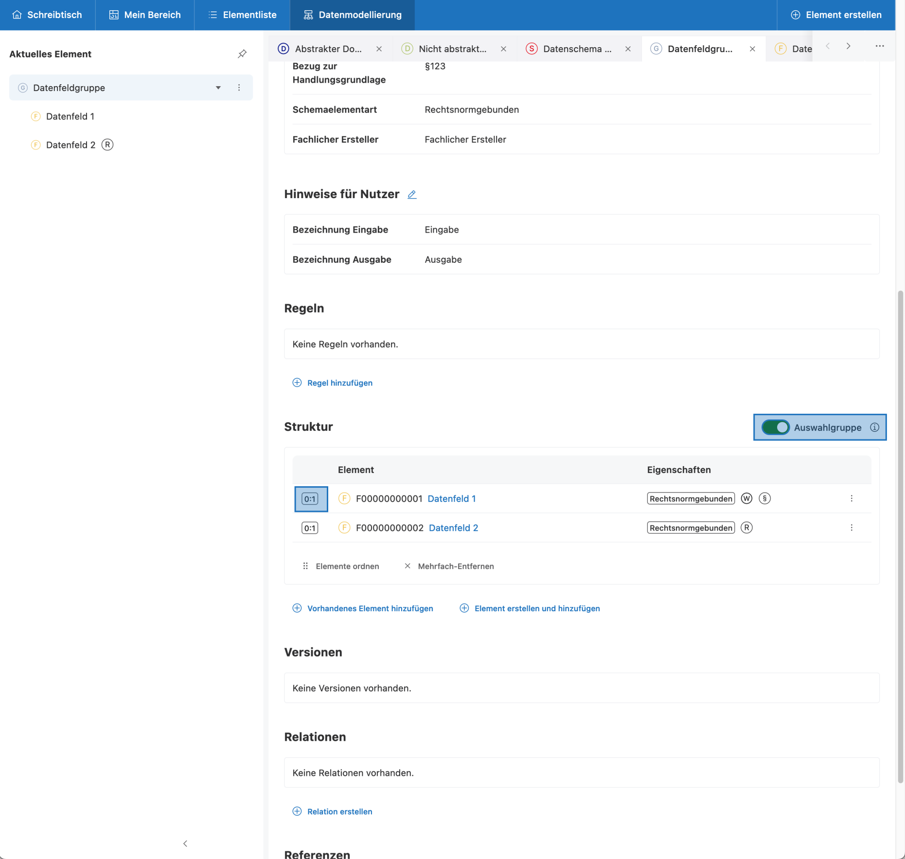 Datenfeldgruppen können 🆕 zur Auswahlgruppe gemacht werden.