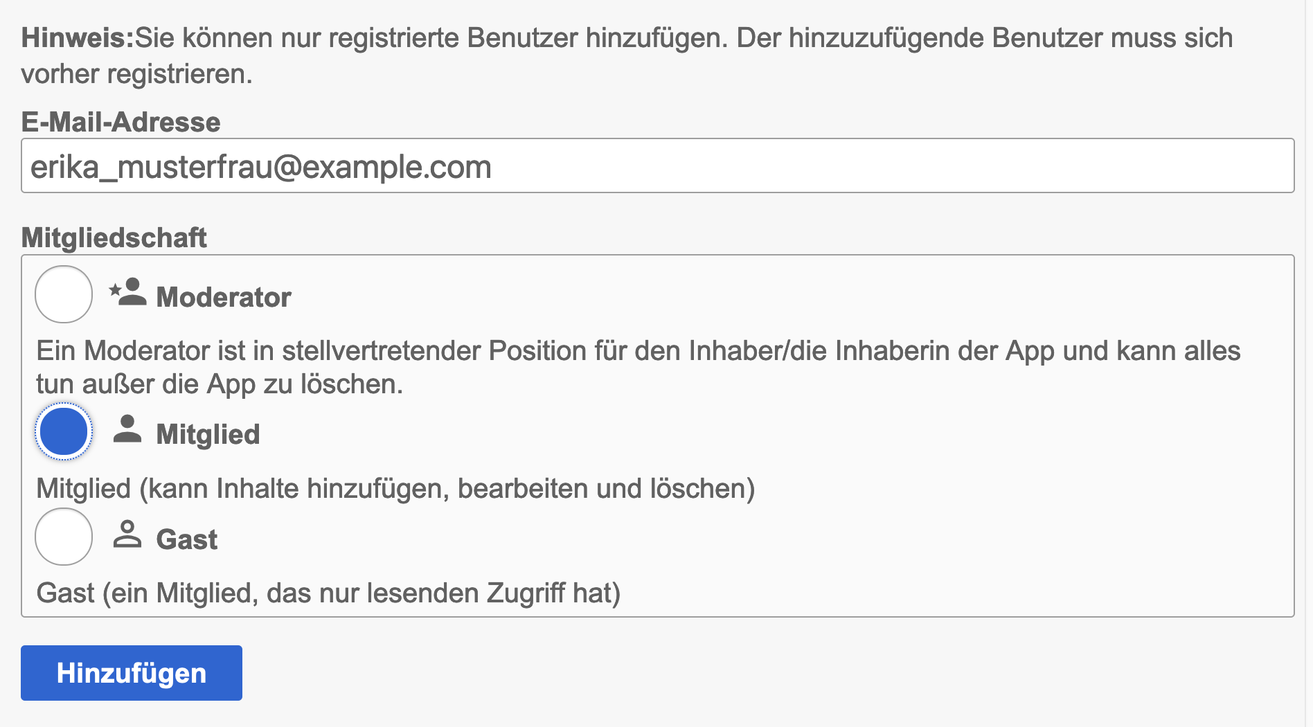 Nachdem auf „Mitglied hinzufügen“ geklickt wurde, erscheint folgende Maske: