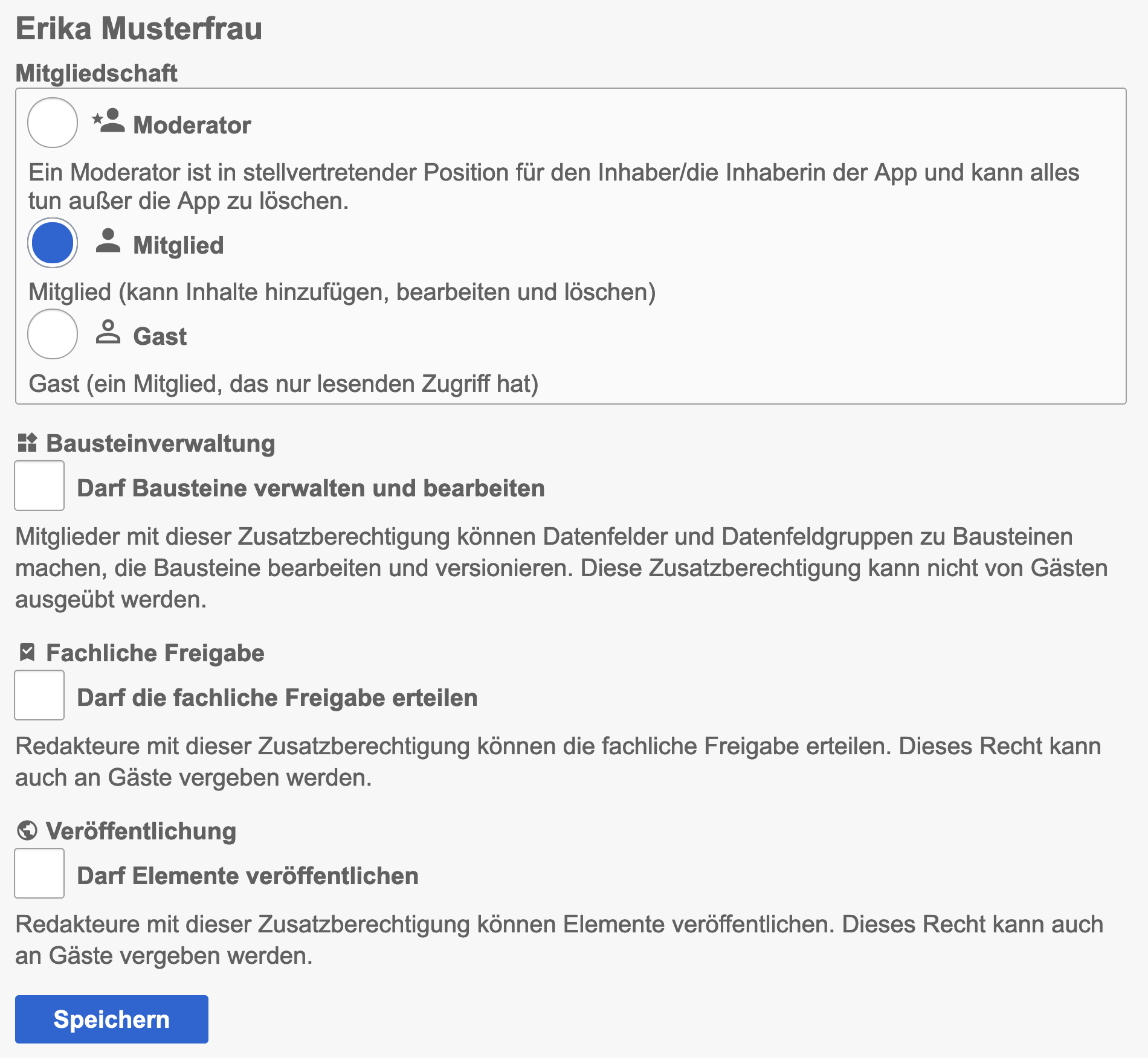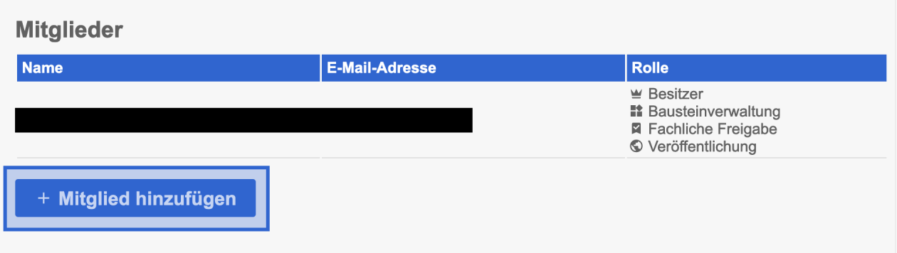 Zusatzberechtigungen wie Bausteinverwaltung, Veröffentlichung oder fachliche Freigabe können erst nachdem die Einladung angenommen wurde gesetzt werden.