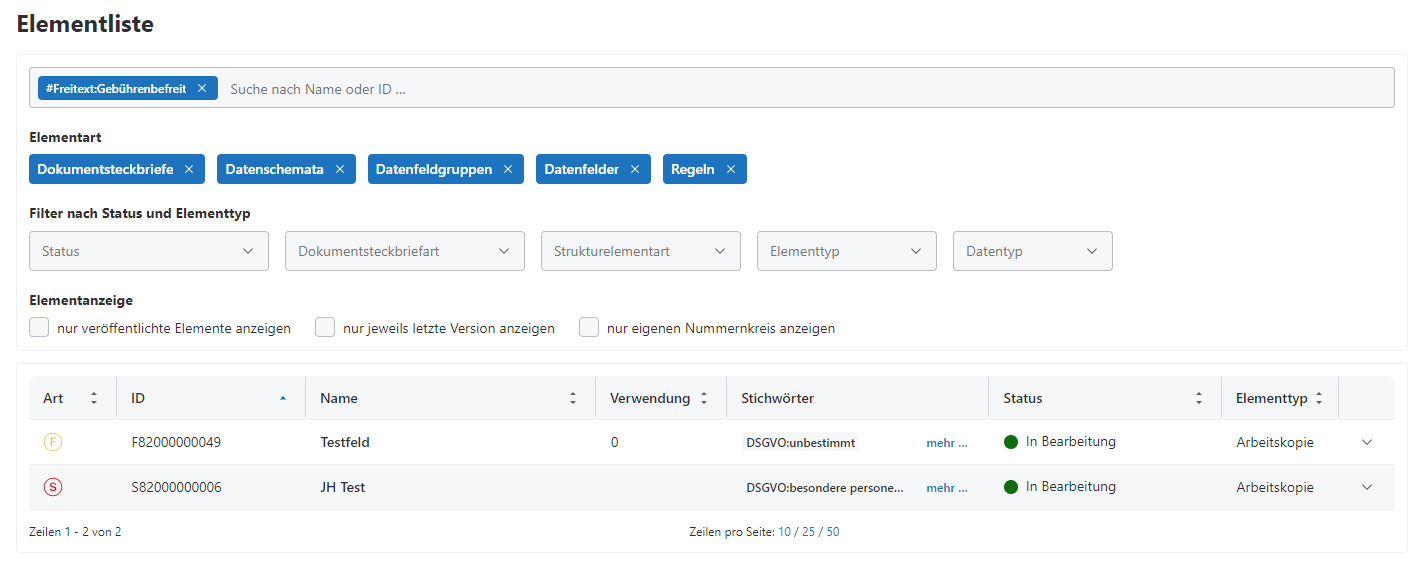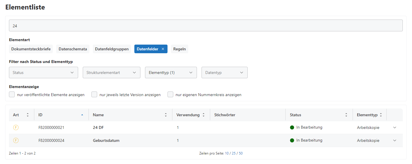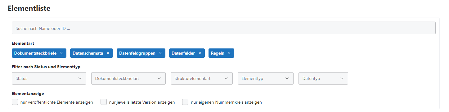Elementart (d. h. Dokumentsteckbrief, Datenschemata, Datenfeldgruppen, Datenfeldern und Regeln) Ausgewählte bzw. für die Suchanfrage aktive Elemente sind blau hervorgehoben.