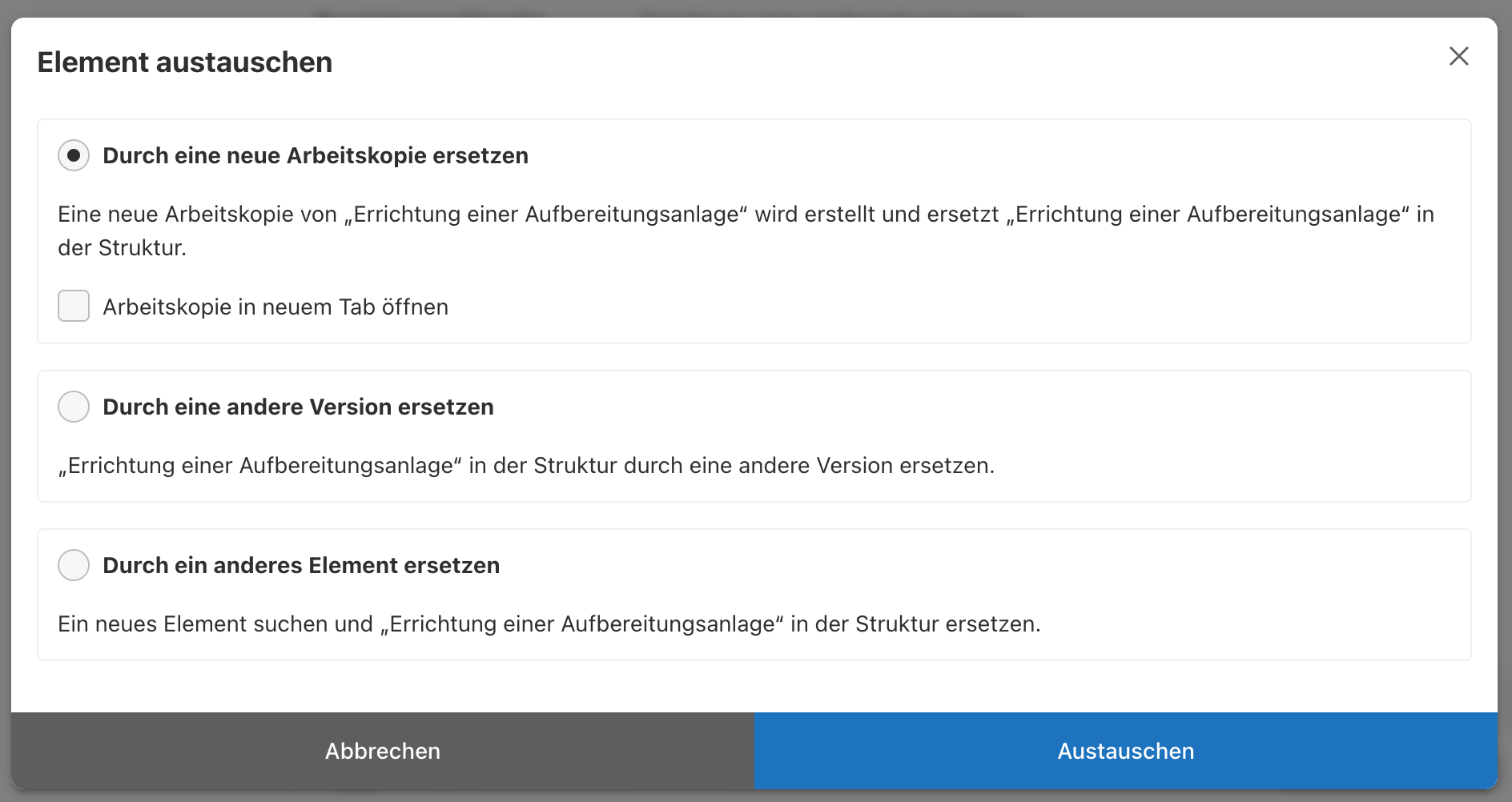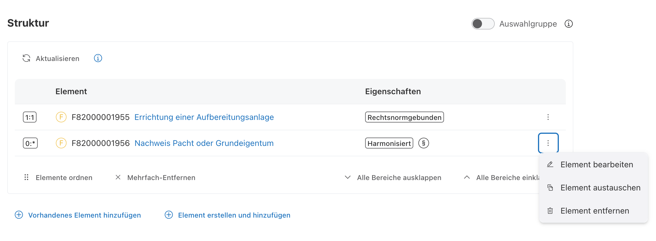 Um ein bestehendes Unterelement in einem Datenschema oder einer Datenfeldgruppe zu verändern, wird auf der Übersicht das Kontextmenü (drei Punkte übereinander) des zu verändernden bzw. bearbeitenden Elements ausgewählt.