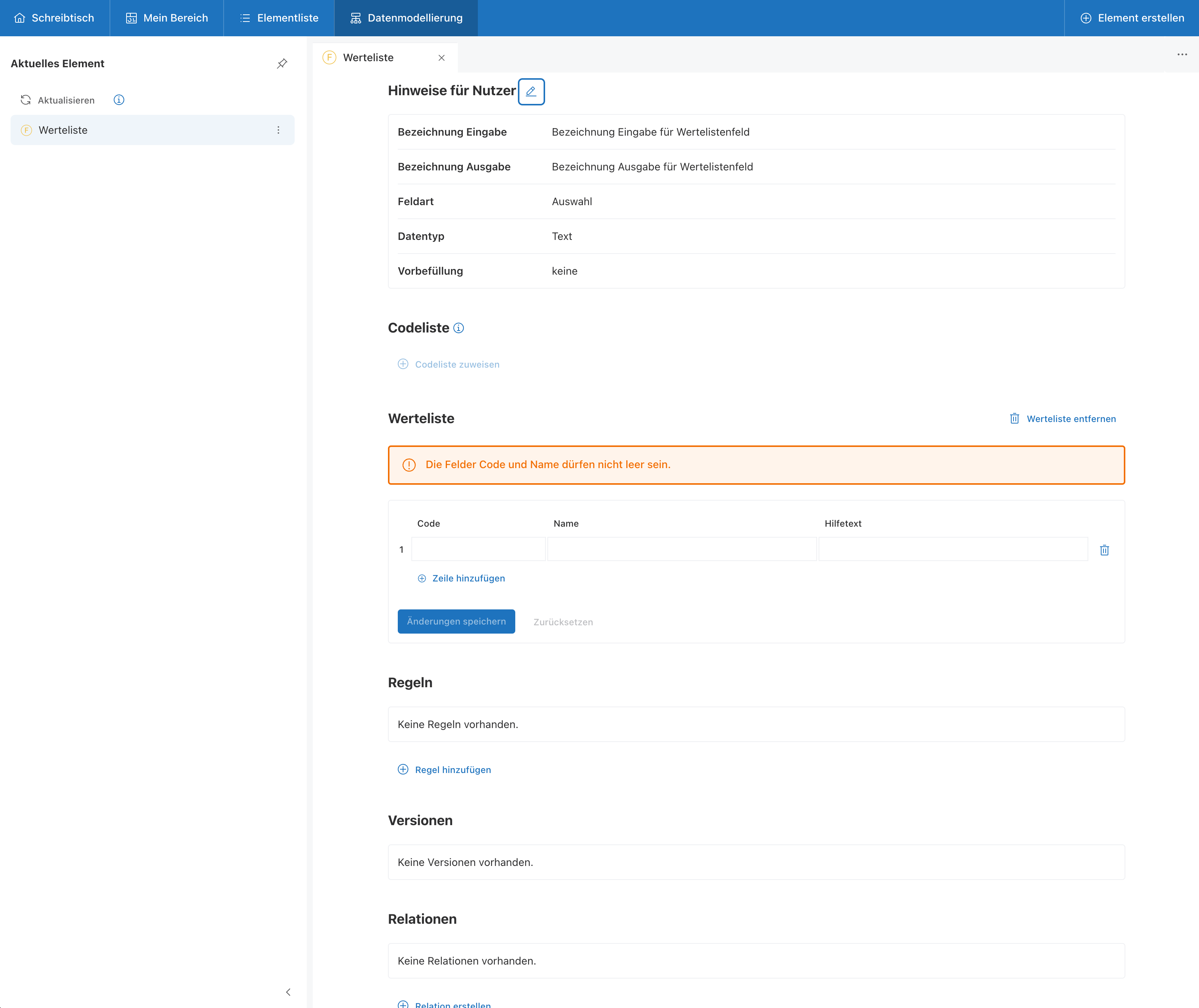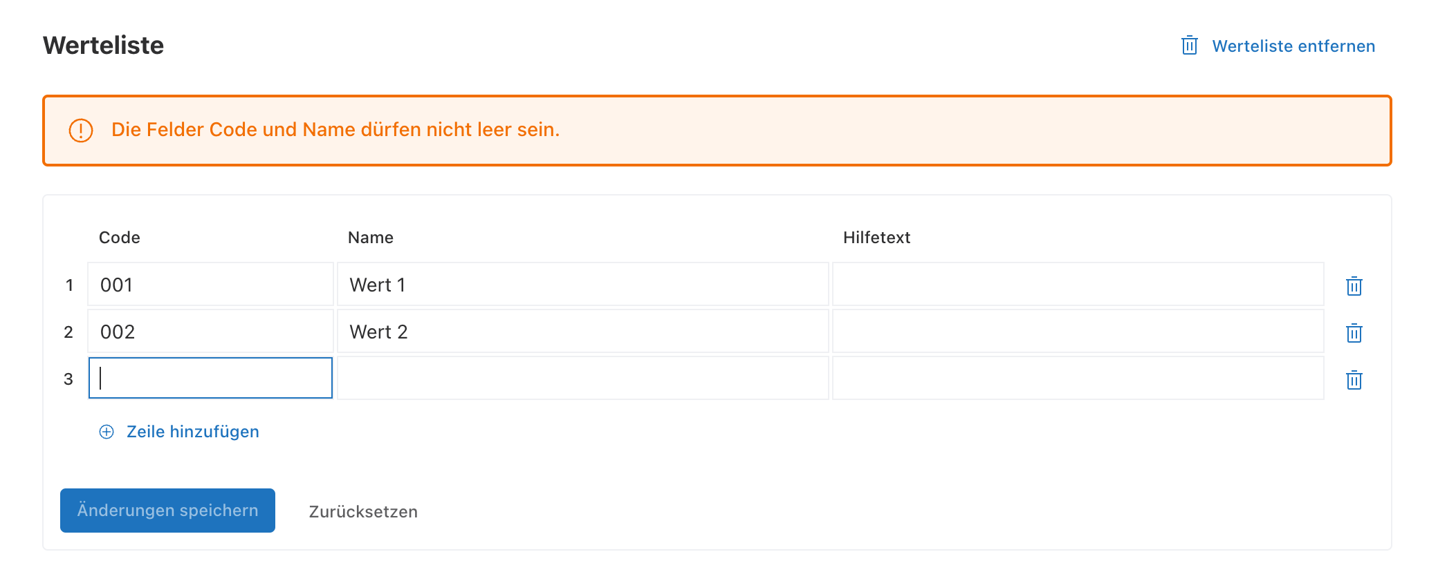 Es können mehrere Werte hinzugefügt werden. Dafür einen eindeutigen dreistelligen Code mit einem Namen und einen optionalen Hilfetext vergeben.
